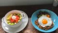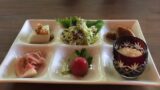 SNS映えポイント:青と白のコントラストが美しい器に盛られた、彩り豊かな一汁三菜。