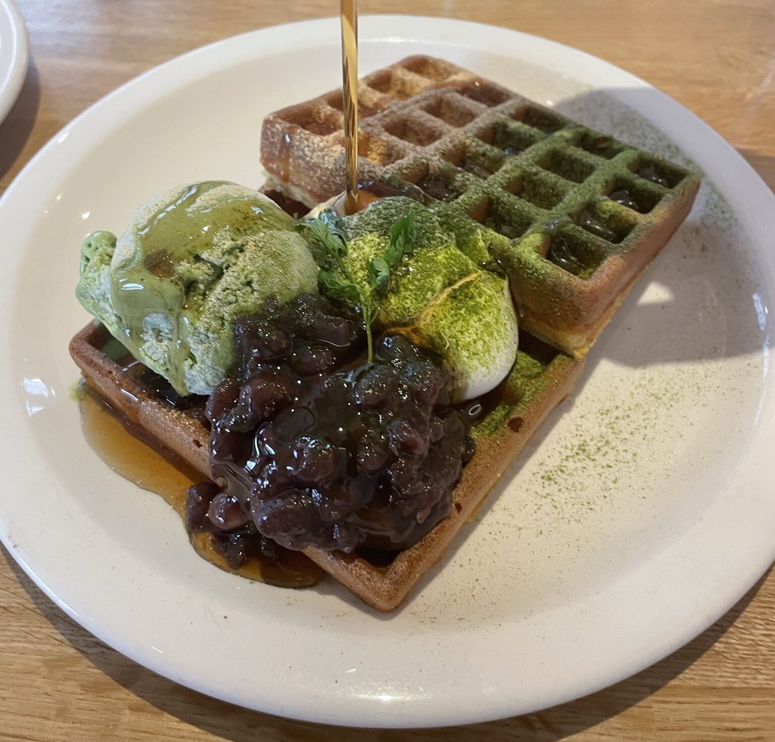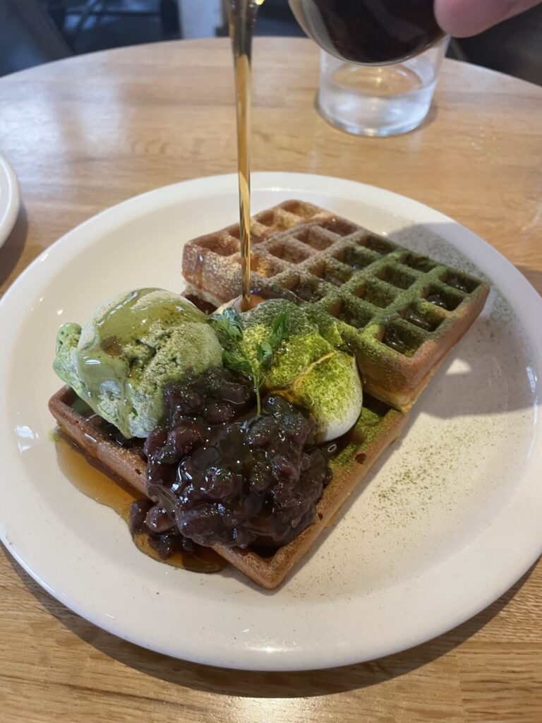 今回は、グリーンティーワッフルをいただきました!ワッフルの上には小倉あんや抹茶アイスがトッピングされており、抹茶パウダーかかっていました。仕上げに特製シロップをかければ完成です!一口食べれば、たちまち抹茶の香りが口な中に広がり幸福感で満たされます!