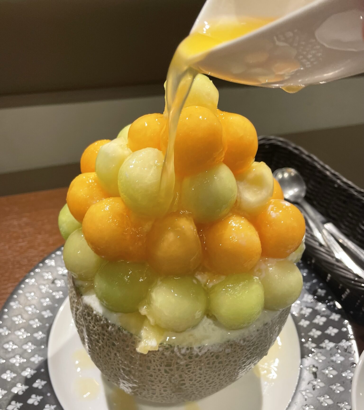 メロンの器にかき氷をのせて、そのかき氷を埋め尽くすほどのメロンの果肉が、これでもかというほどのっています。仕上げに、その上からメロンシロップをかけて完成です!一口食べれば、口いっぱいにメロンの香りが広がります!でもちょっと重そうでよね・・・