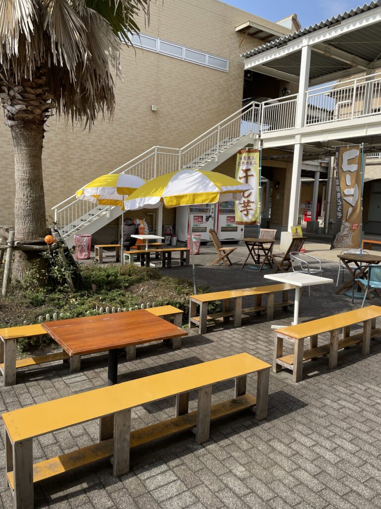店の前には、屋外テラスが設置してありクレープを食べながら一休みできます。アンコウチームもここでクレープを食べていましたよね!