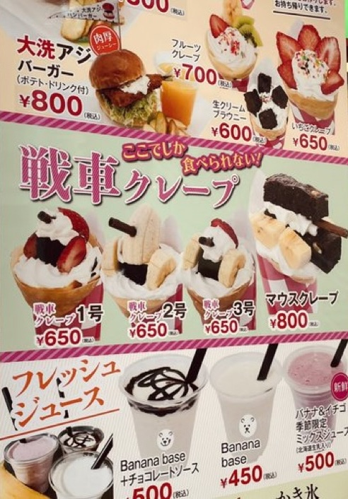 大洗の海を眺めながら食べるクレープは絶品です!チョコバナナやいちごなど定番クレープもいいですが、キラキラクレープに来たなら、ぜひ戦車クレープを食べてみてください!