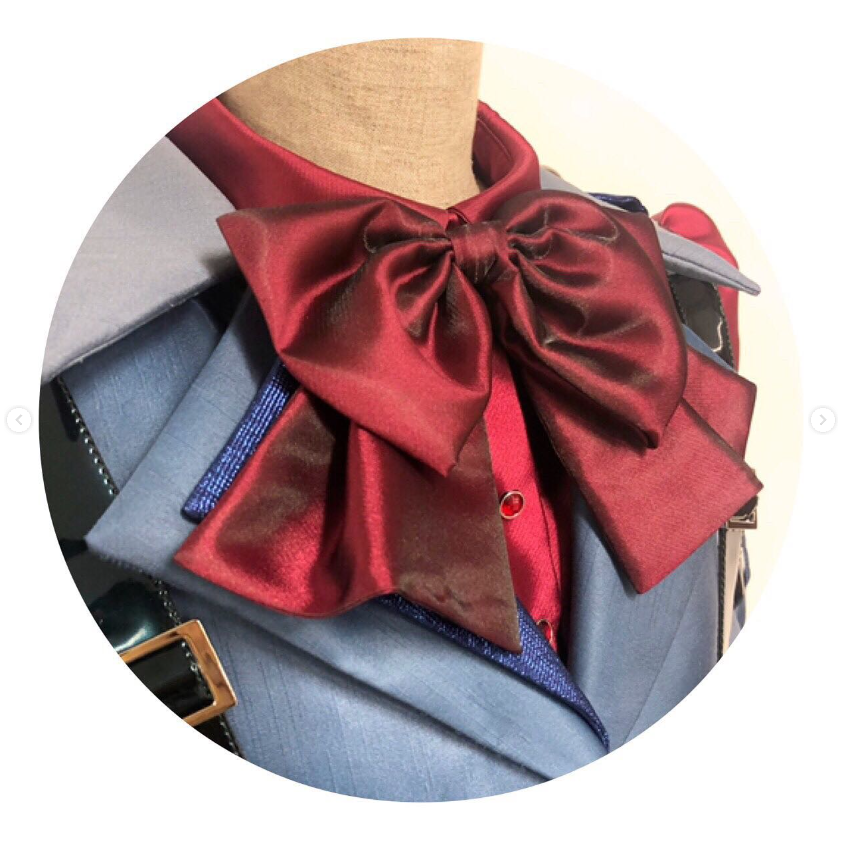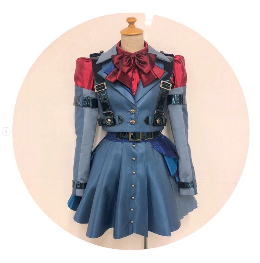 衣装は、ネイビー×レッドの二色を使用しており、パキッとした印象を与えています。また、上半身にはハーネスベルトを使用していることで、衣装全体のアクセントにもなっています。