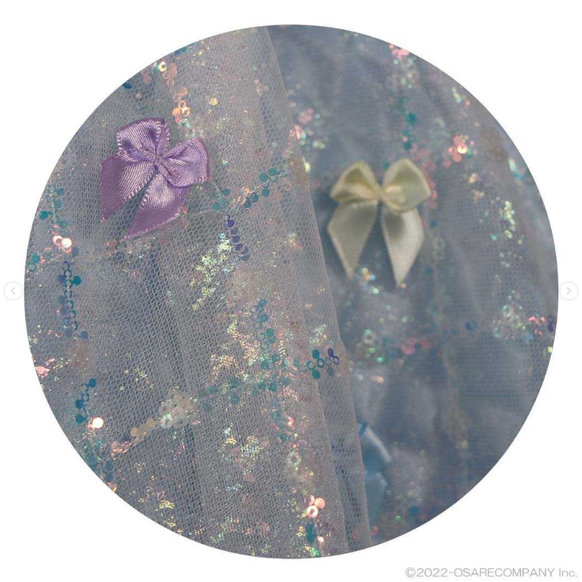 この衣装は、ピンク・水色・紫の配色にパフスリーブのデザイン、さらにキルティングやボア素材の生地が使われていたりと、とにかくかわいいに全振りしたデザインであることが特徴です。ふわふわリボンのヘアアクセサリーも特徴的で、頭からつま先までかわいいんです!