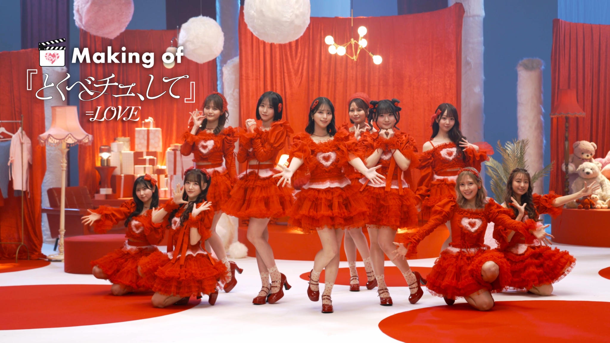 衣装が楽曲の世界観にマッチする部分がポイント!この楽曲はあまあまでキュートな歌詞が特徴で、恋する気持ちがぎゅっと詰まっています。情熱的なカラーである真っ赤なドレスに胸元の大きなハートは、楽曲のあまくて可愛らしい雰囲気にぴったりなデザインとなっています!また、MVの世界観も全体的に赤を基調としていて、楽曲・映像・衣装の全てが一つになって、恋する気持ちを存分に表現しています!